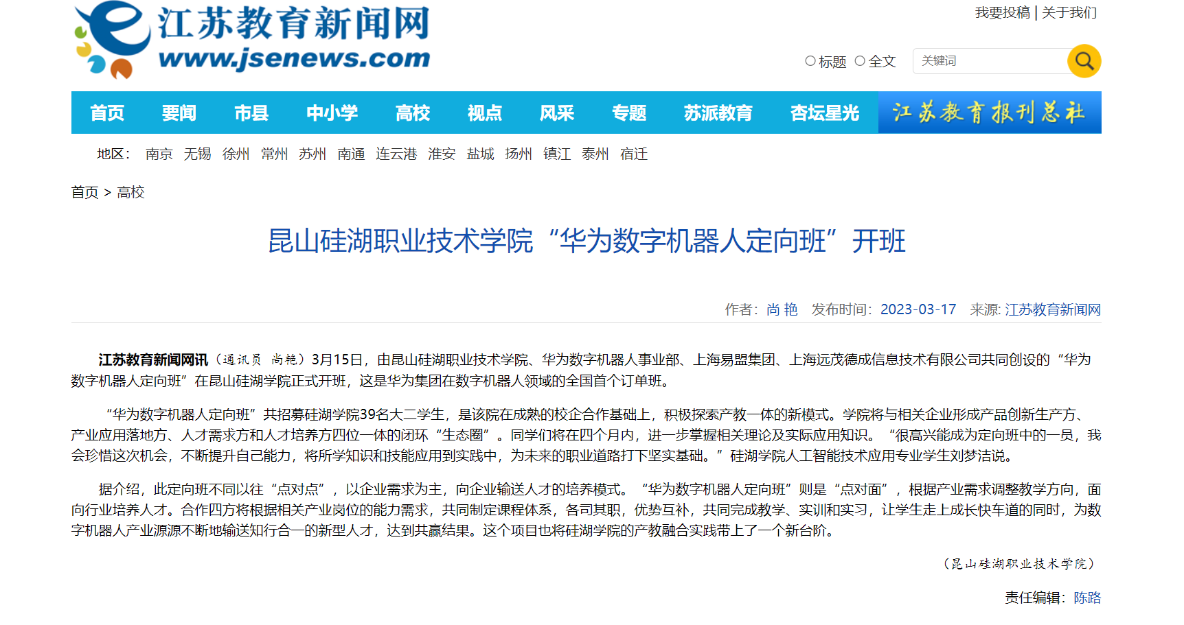 【江苏教育报】昆山硅湖职业技术学院“华为数字机器人定向班”开...