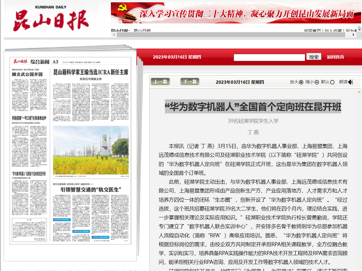【昆山日报】“华为数字机器人”全国首个定向班在昆开班