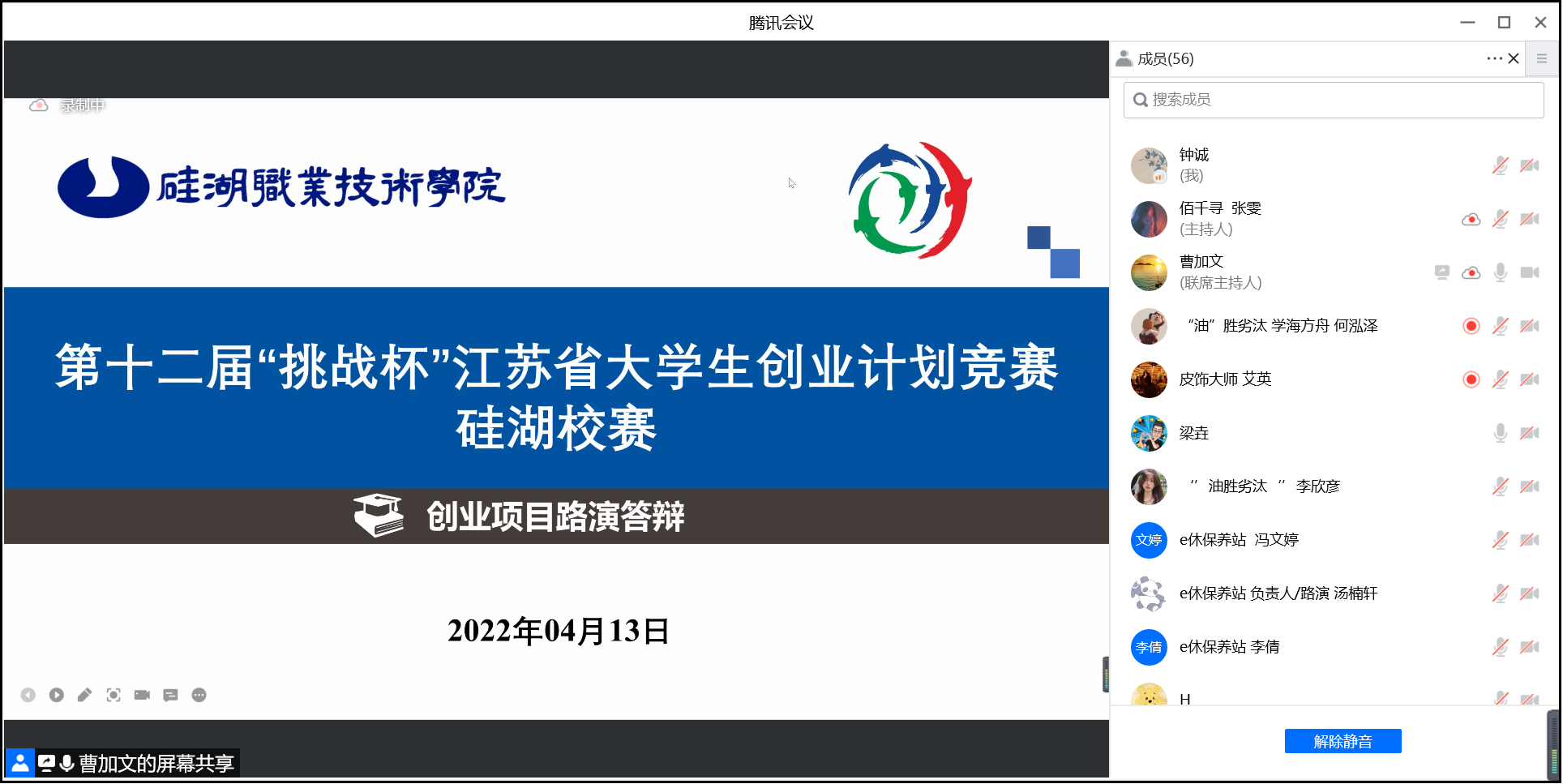 4月13日14:00第十二届“挑战杯”中国大学生创业计划大赛硅湖校赛在腾讯会议拉开序幕。本次大赛由大创办曹加文副主任主持。大赛开始前邀请了上海应用技术大学团委书记梁垚针对“挑战杯”创业计划大赛的变化进行了一个简短的普及。