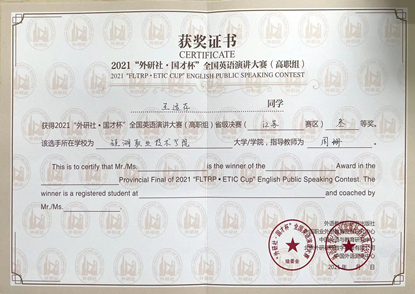 "外研社·国才杯"英语赛事是举办时间较长、水平较高的大学生英语专业技能比赛。王适存同学的获奖,充分展现了我校英语教学改革和"第二课堂"建设的优秀成果。