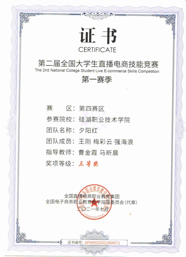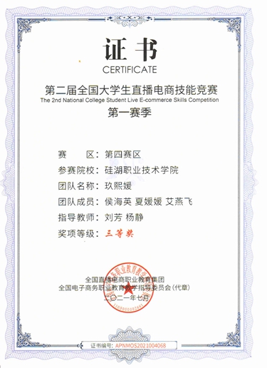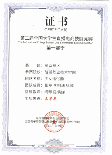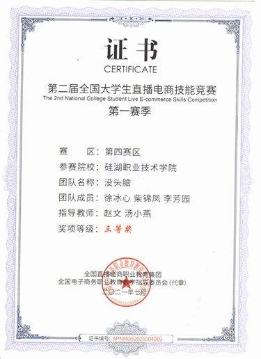 2021年10月15日106月30日,由全国直播电商职业教育集团主办的第二届全国大学生直播电商技能竞赛第一赛季成功举办。大赛按地域分五个赛区进行,经线上报名选拔,苏浙皖三省职业院校组成的第四赛区共49支参赛团队,11月组委会公布我校经管学院电子商务专业四支学生团队,一队王刚、梅彩云、强海浪,二队张芹、李明珠、徐萍,三队侯海英、夏媛媛、艾燕飞,四队徐冰心、柴锦凤和李芳园12名同学在直播运营和直播模拟环节中喜获三等奖,学校获优秀组织单位奖。