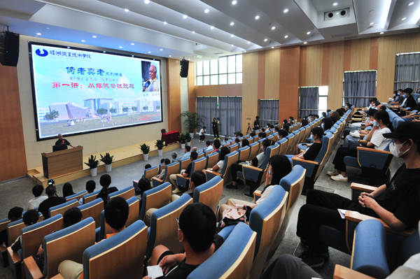10月6日下午,79岁的学校创办人、名誉董事长梁顺才博士来到育才楼104报告厅,为硅湖师生带来了“倚老卖老”系列讲座第一讲。