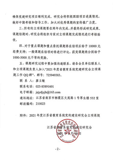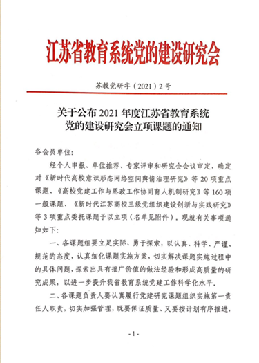 为深入学习贯彻习近平新时代中国特色社会主义思想和党的十九大精神,积极探索我省教育系统党建工作的新思路、新方法、新举措,进一步提升党建研究科学化水平,全面提高各级各类学校党的建设质量,江苏省教育系统党的建设研究会面向全体会员单位开展2021年度党建研究课题申报工作。