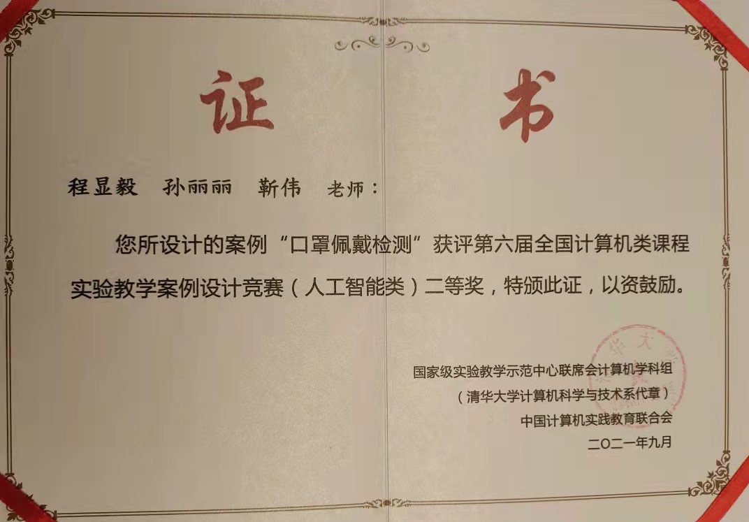 2021年9月25-26日,第五届中国计算机实践教育学术会议暨第十四届全国高等学校计算机实践教学论坛在吉林长春举办,同期举办了第六届全国计算机类课程实验教学案例设计竞赛。我校计算机学院程显毅、孙丽丽、靳伟老师申报的实验教学案例“口罩佩戴测试”在本届全国计算机类课程实验教学案例设计竞赛中获得全国二等奖,并作为优秀实验案例进行了现场展示。