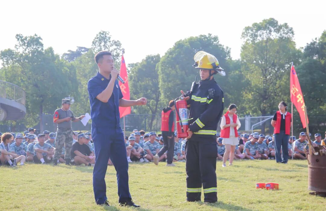 全部人员集中后,花桥消防中队教员结合校园火灾防控特点,为新生带来了一场干货满满的“实战化消防课堂”。教员系统讲解了消防安全基础知识与日常防范措施;通过实物展示,详细介绍了干粉灭火器、消防水带、防烟面具等常用消防器材的适用场景、工作原理及操作禁忌;针对“初期火灾如何快速处置”这一核心问题,他现场示范了灭火器“提—拔—握—压”的规范操作流程,并用通俗的语言拆解了每个步骤的关键细节。随后,在教员的专业指导下,新生代表依次上前实操演练,拿起灭火器对准“火点”精准喷射,成功扑灭模拟火焰,在“零距离”体验中掌握了灭火技能,将理论知识转化为实战能力。