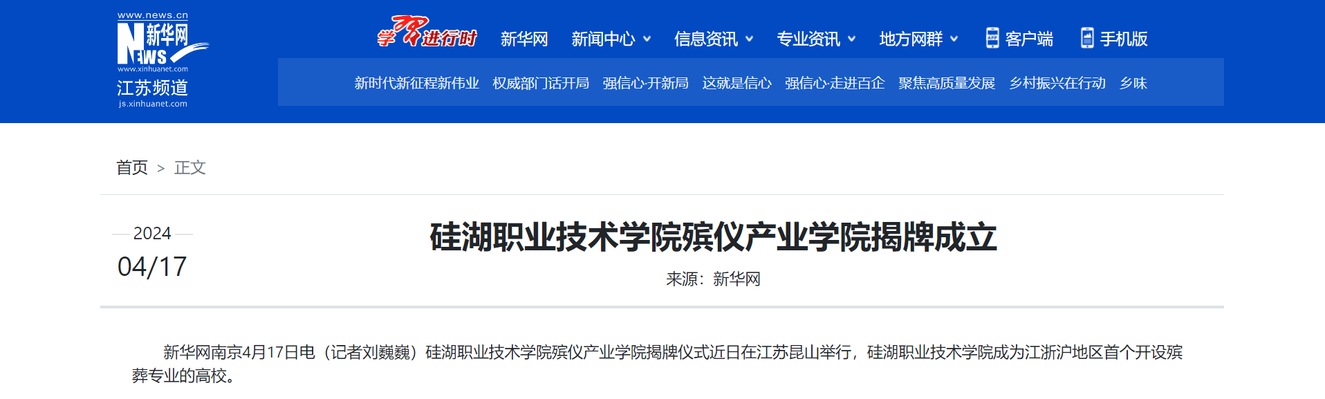 新华网南京4月17日电(记者刘巍巍)硅湖职业技术学院殡仪产业学院揭牌仪式近日在江苏昆山举行,硅湖职业技术学院成为江浙沪地区首个开设殡葬专业的高校。
