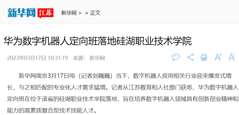 新华网南京3月17日电(记者刘巍巍)当下,数字机器人应用相关行业迎来爆发式增长,与之相匹配的专业化人才需求猛增。记者从江苏教育和人社部门获悉,华为数字机器人定向班在位于该省的硅湖职业技术学院落地,旨在培养数字机器人领域具有创新创业精神和能力的高素质复合型技术技能人才。