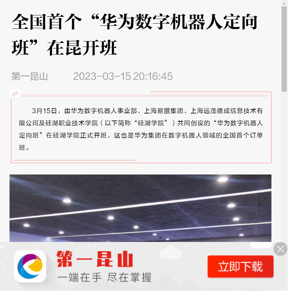 3月15日,由华为数字机器人事业部、上海易盟集团、上海远茂德成信息技术有限公司及硅湖职业技术学院( 以下简称“硅湖学院” ) 共同创设的“华为数字机器人定向班”在硅湖学院正式开班,这也是华为集团在数字机器人领域的全国首个订单班。