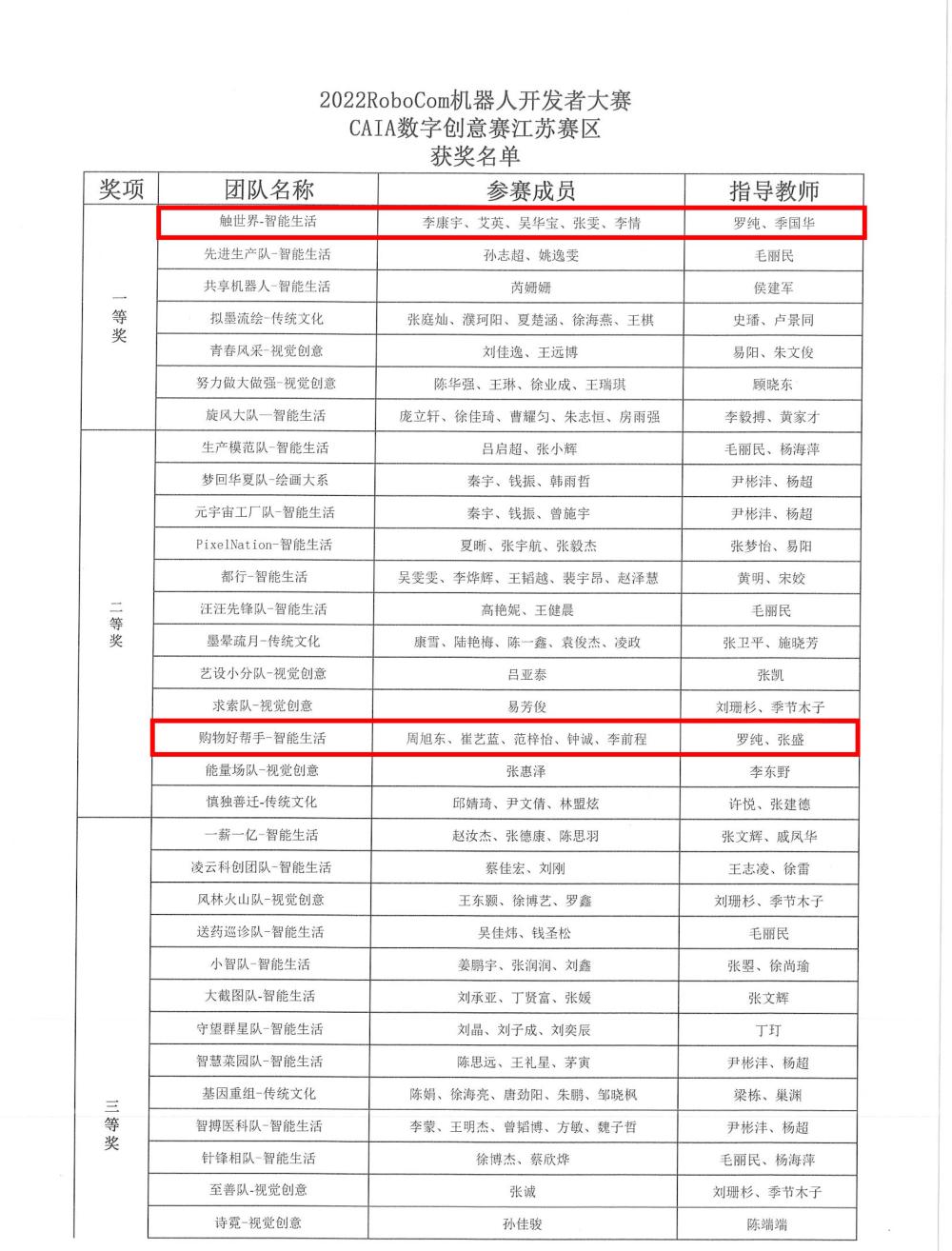 2022RoboCom机器人开发者大赛CAIA数字创意赛江苏赛区获奖名单近日公布,硅湖职业技术学院“触世界—智能生活”团队和“购物好帮手—智能生活”团队分别获得一等奖和二等奖,晋级全国总决赛,其中,“触世界—智能生活”团队排名首位。