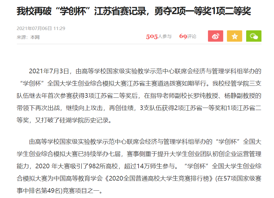 2021年7月3日,由高等学校国家级实验教学示范中心联席会经济与管理学科组举办的“学创杯”全国大学生创业综合模拟大赛江苏省主赛道选拨赛如期举行。我校经管学院三支队伍继去年首次参赛获得3项江苏省二等奖后,在指导老师副校长罗纯教授、杨静副教授的带领下再次出战,继续向上攻击,再创佳绩,3支队伍获得2项江苏省一等奖和1项江苏省二等奖,又打破了硅湖学院历史记录。