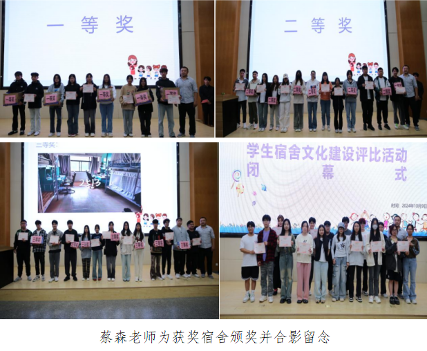 晚上18点30分,育才楼104教室内举行了隆重的颁奖仪式。经过2个小时的认真评选,20间优秀宿舍从90间宿舍中脱颖而出。荣获一等奖的宿舍有:女生宿舍2320、1509、2509,男生宿舍1416、1437。二等奖宿舍包括:女生宿舍1521、2317、2407、2412,男生宿舍1423、1440、1410。三等奖宿舍则有:女生宿舍2313、2307、2513、2511,男生宿舍1406、1411、1438、1426。此外,还有进步奖宿舍若干。蔡森老师为获奖宿舍颁奖并合影留念。
