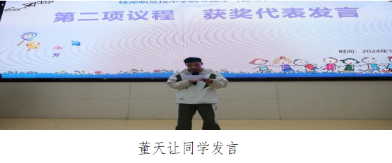 颁奖结束后,24级机械专业的董天让同学作为获奖代表上台发言。他分享了宿舍成员之间团结友爱、互帮互助、共同进步的经历,以及他们如何共同努力营造出温馨和谐的宿舍氛围。他表示,他们将以更高的标准要求自己,保持良好的宿舍环境和积极向上的精神风貌,为班级、学校树立榜样。