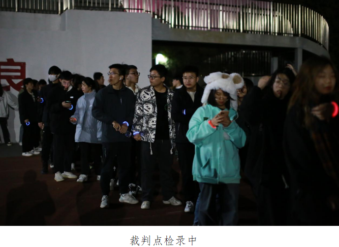 夜跑比赛前,参赛人员检录和手环分发井然有序。2022、2023级班委们各司其职,操场上总共设有四个裁判点位,裁判员们在各自的点位上维持秩序。随着活动的开始,操场也变得热火朝天。
