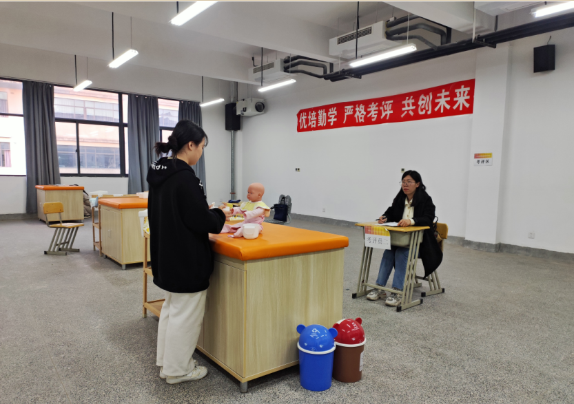 理论考试主要为上机考试,学生需要在系统中针对幼儿照护题库中随机抽取的100道题目进行回答。实践操作考试将在21道操作题目中抽取2道题目进行现场操作,学生按照任务要求进行实操考试,必须在规定的时限内完成。