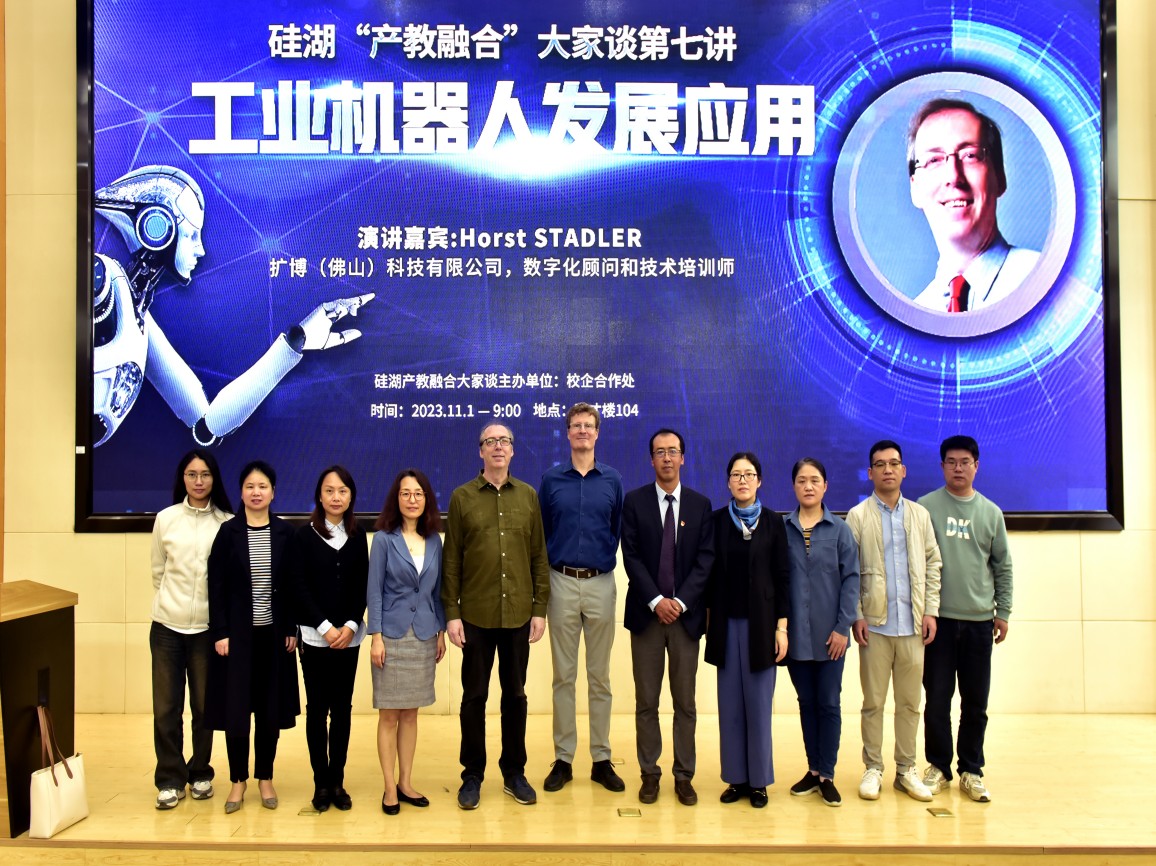 11月1日,校企合作处与机电工程学院联合举办了硅湖“产教融合”大家谈系列第六讲活动。扩博(佛山)科技有限公司数字化顾问和技术培训师Horst Stadler先生应邀为我校师生开展了一场题为《工业机器人发展应用》的讲座。