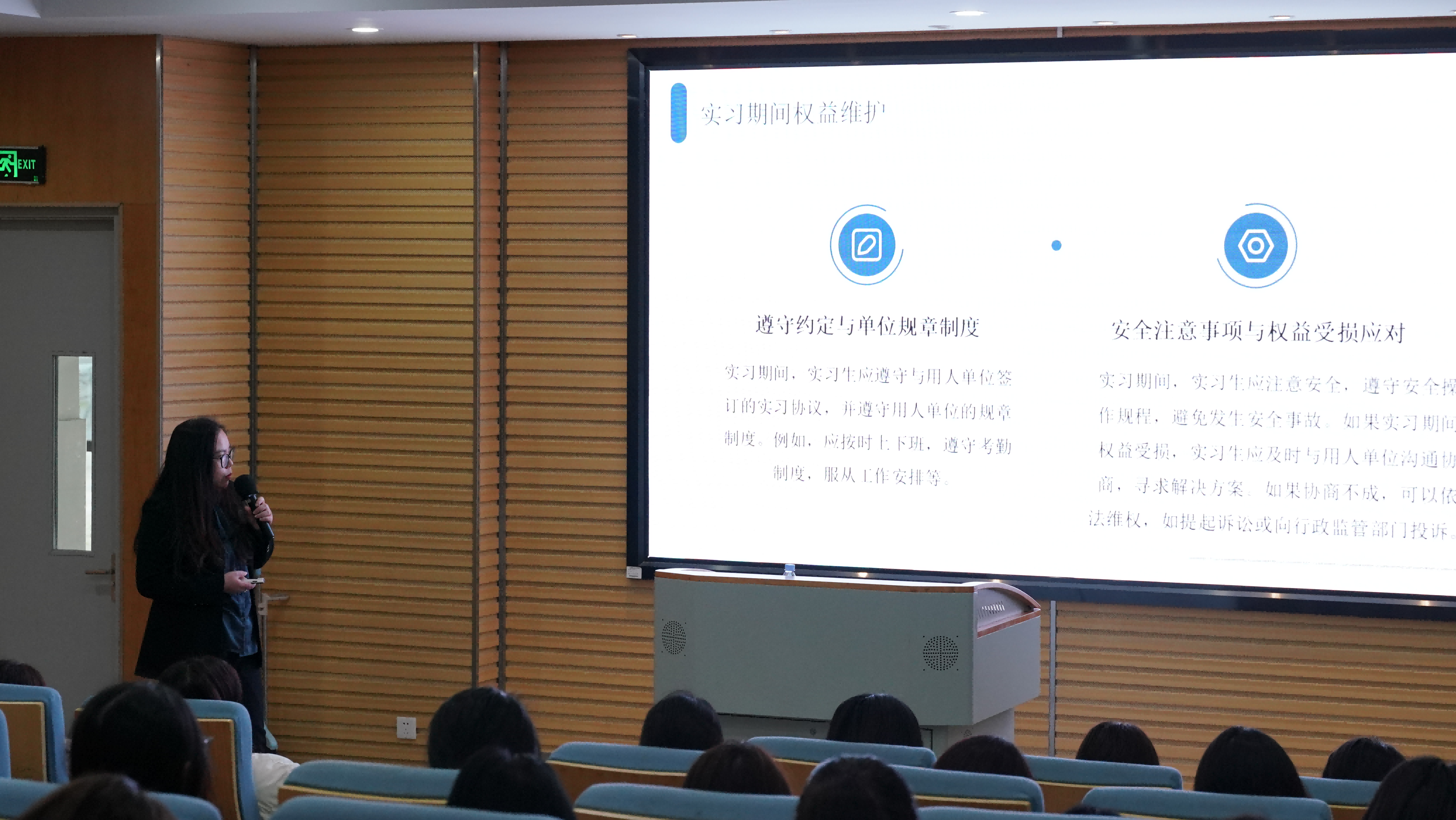 接着,蒋律师深入讲解了职场女性权益保障的相关法律法规。她提到,我国已制定多项法律和政策,旨在保护女性劳动权益,推动性别平等。她还鼓励学生们要积极学习这些法律法规,以便在必要时能够捍卫自己的合法权益。