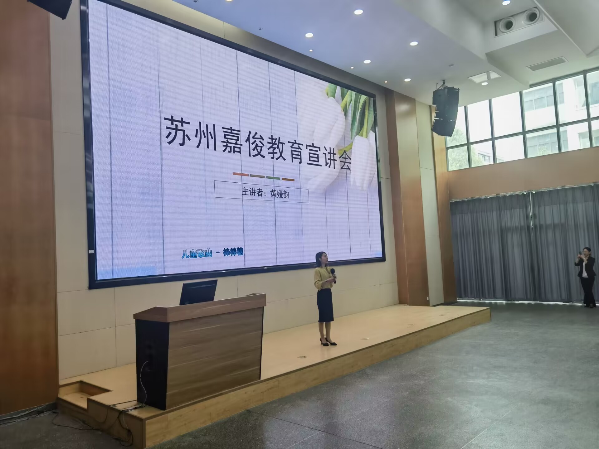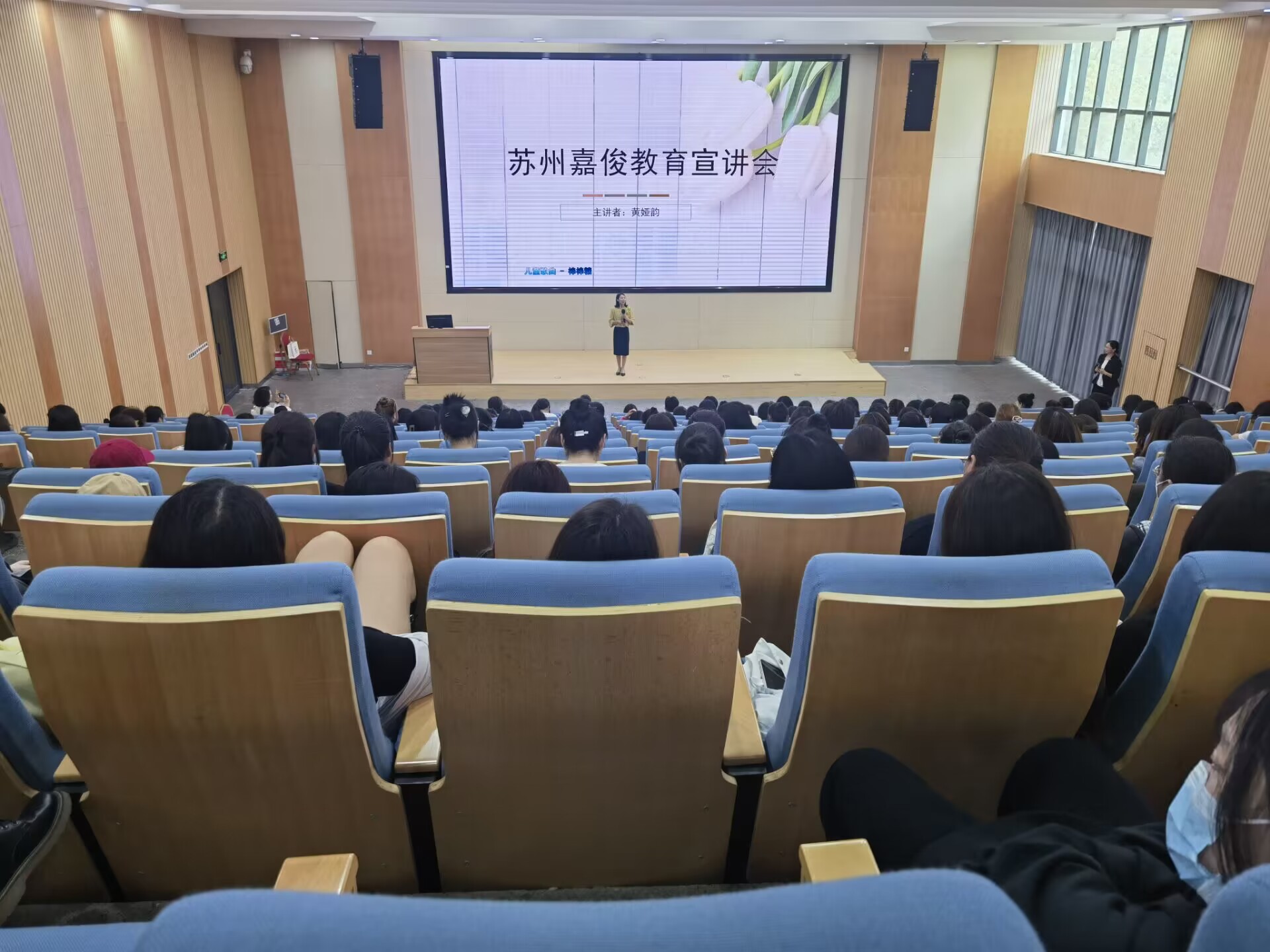 宣讲会上, 苏州嘉俊教育集团校园招聘负责人先后以视频、图片、PPT等方式,从企业文化、企业核心价值观、企业岗位需求及用人标准、企业人才储备及人才培养等多方面进行宣讲,为同学们了解企业打开了一个窗口。