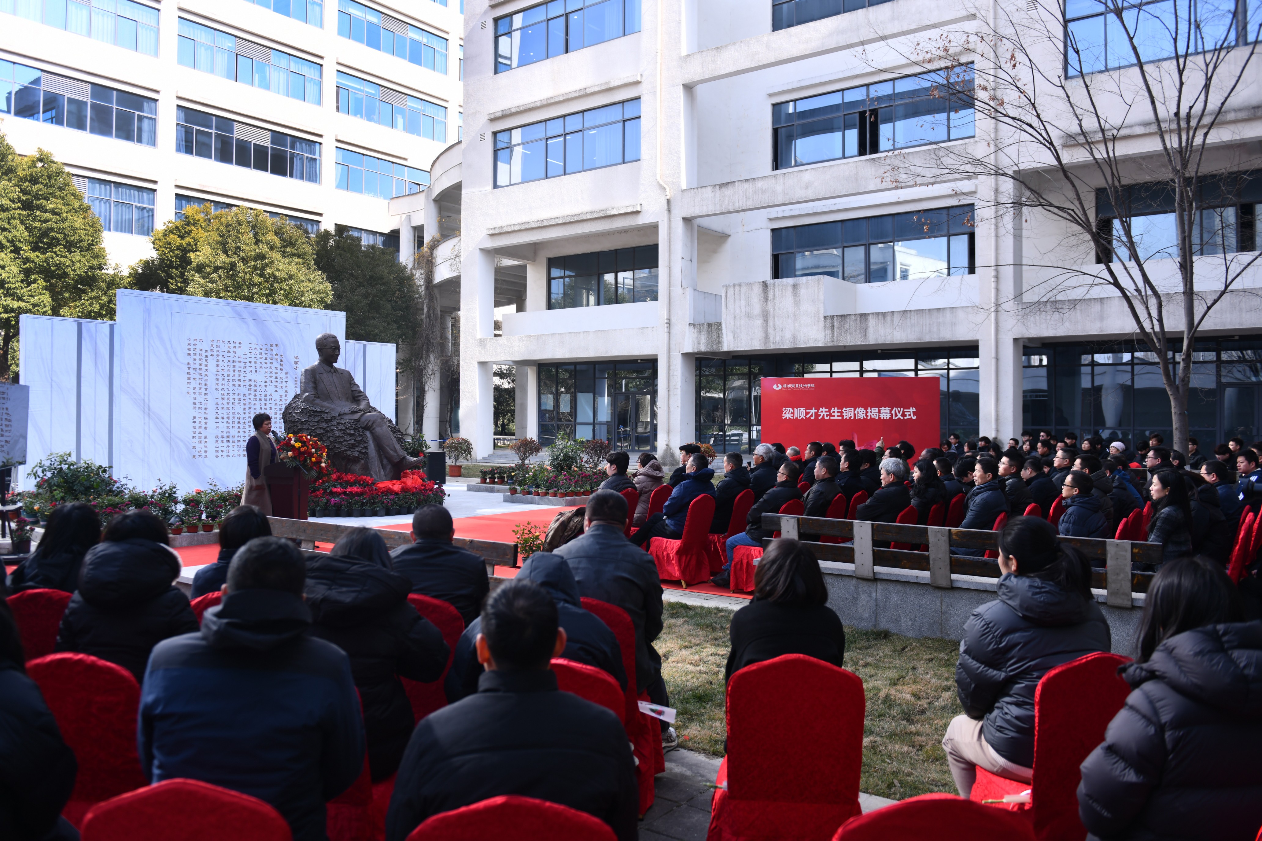接着由原南京工程学院党委书记、原硅湖职业技术学院校长刘泽南教授和硅湖职业技术学院党委书记丁鹏教授为梁顺才博士的铜像隆重揭幕。