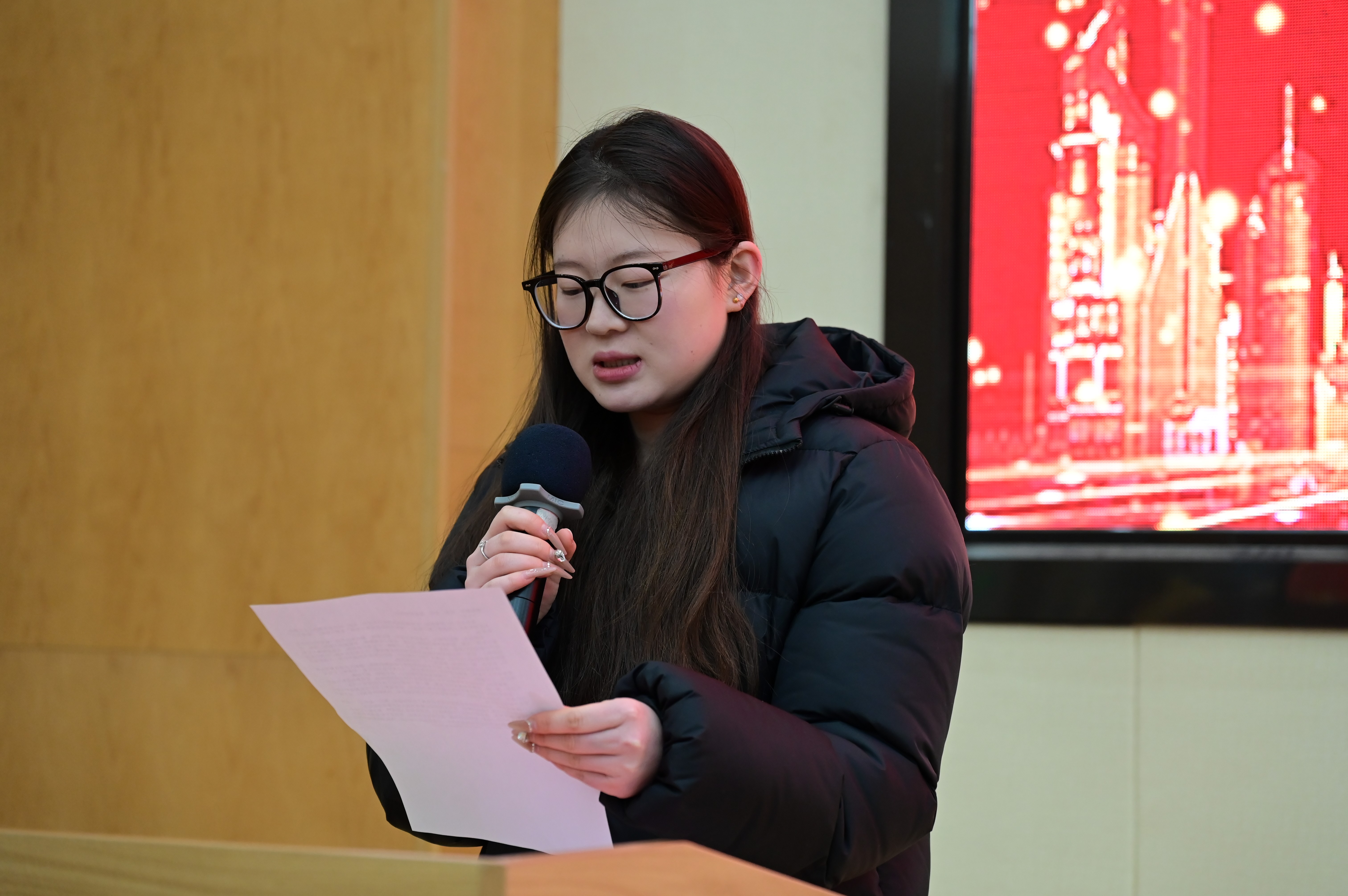 颁奖完毕后,造价231班耿雨欣同学作为获奖学生代表发言,她总结了竞赛中的不足,也表达了对未来的决心,以后大家将不忘初心,不断前行,勇于探索,敢于创新。她代表所有学生感谢天合建设集团对教育事业的大力支持,感谢对青年学子的深情关怀,感谢学校提供的丰富资源和平台,感谢老师们的教诲和辛勤付出,感谢同学们的一路陪伴。