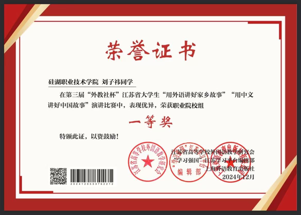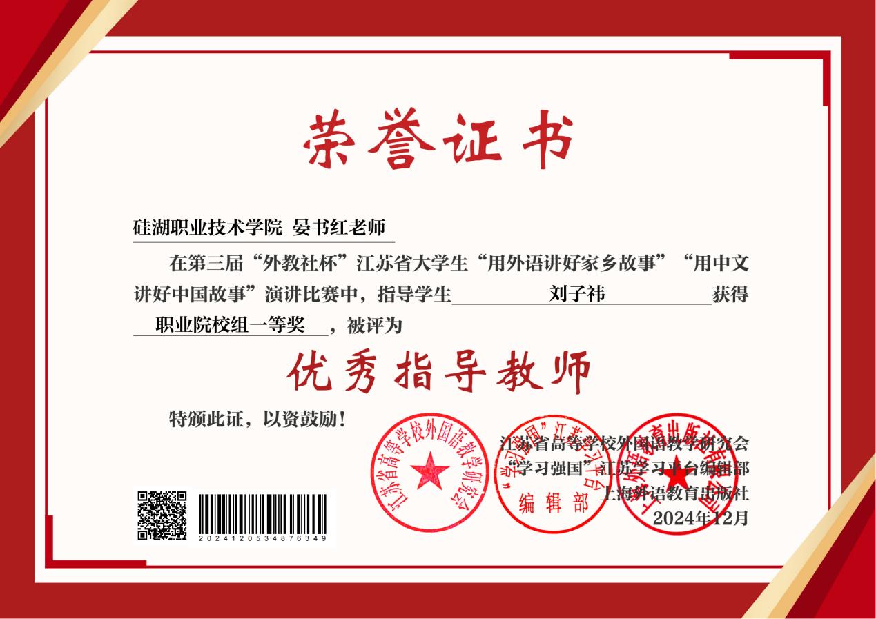 近日,第三届“外教社杯”江苏省大学生“用外语讲好家乡故事”“用中文讲好中国故事”演讲比赛圆满落幕。硅湖职业技术学院的刘子祎同学在此次比赛中表现优异,荣获职业院校组一等奖!同时,晏书红老师凭借对刘子祎同学的杰出指导,助力其在比赛中获奖,被评为优秀指导教师。