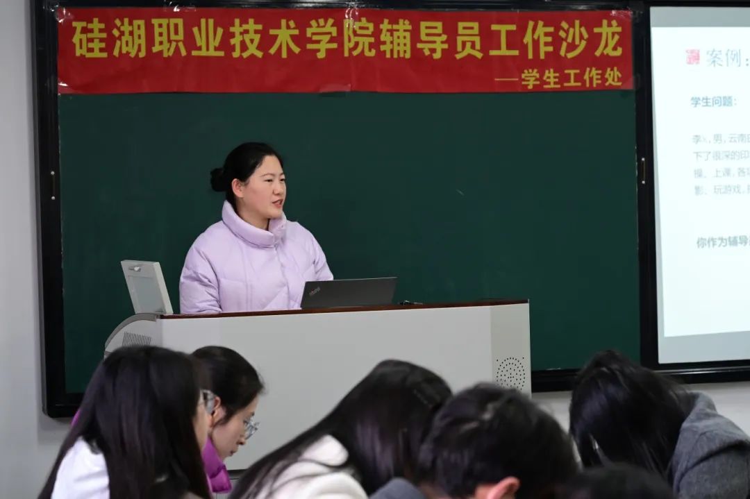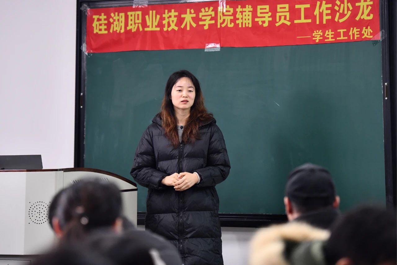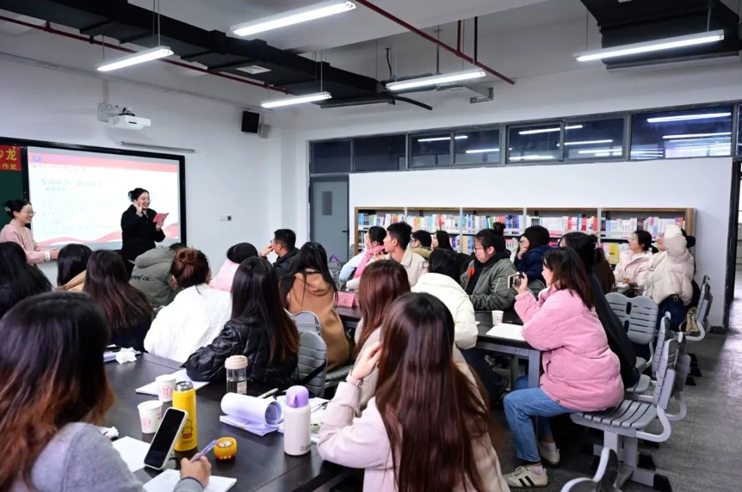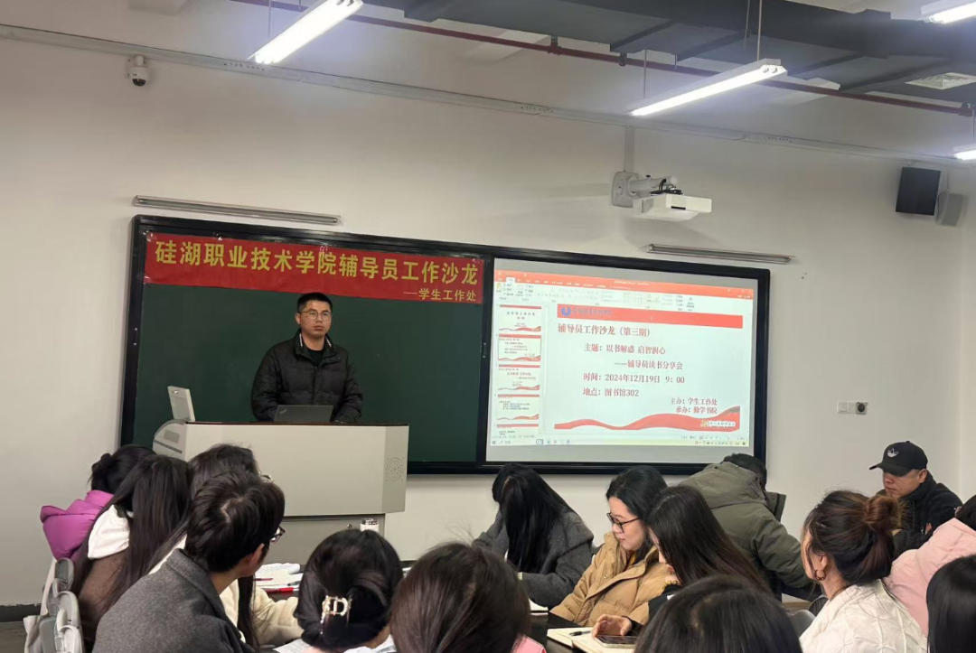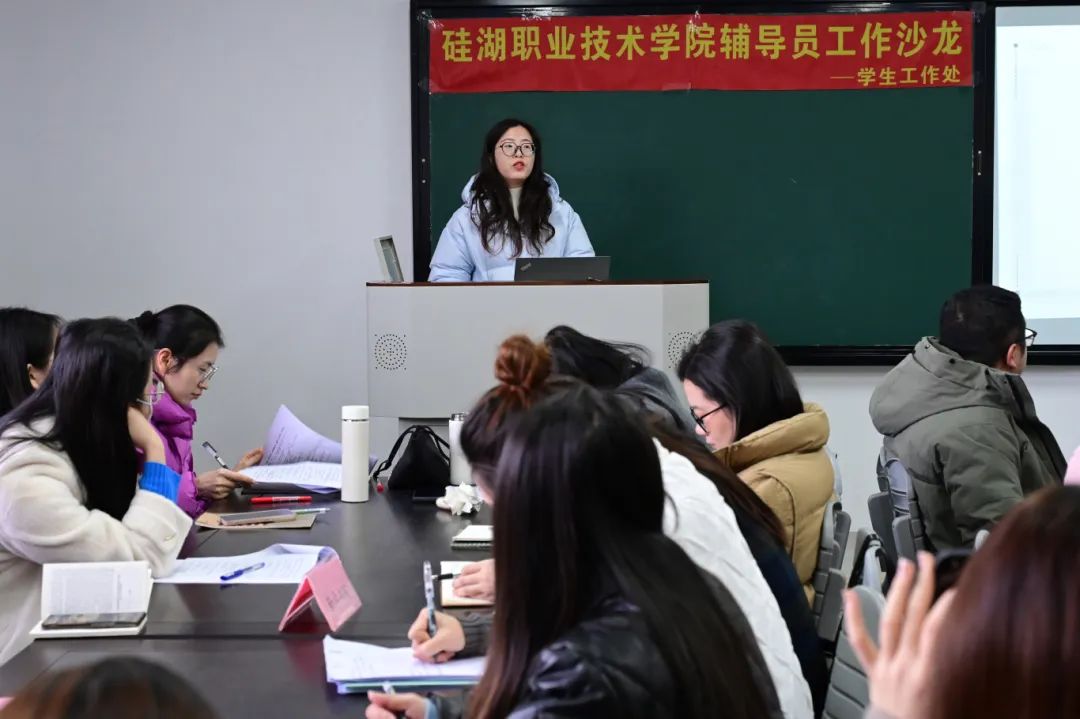 辅导员作为学生成长道路上的重要引路人,其自身的学习与提升也显得尤为关键。辅导员不仅是学生日常行为的管理者,更是思想的启迪者与心灵的呵护者,其综合素质直接映射在学生的培养成果之中。学工处精准洞察到这一内在联系,将辅导员队伍建设嵌入学院长远发展的蓝图。12月19日上午,硅湖职业技术学院学工处在图书馆 302成功举办了辅导员工作沙龙第三期活动。此次活动吸引了全体辅导员的积极参与,同时还特邀学工处常务副处长潘纪龙、团委书记施建华以及学工处副处长陈建隆等领导莅临现场进行观摩指导。 本次沙龙紧紧围绕 “以书解惑,启智润心” 这一核心主题,精心划分为三个关键环节。首先是读书分享环节,刘景慧、豆亚芳、李梅三位老师分别分享了《辅导员工作100个怎么办》、《萌哥说案例》、《高校辅导员的七项修炼》三本书籍的经典内容及个人感悟。现场气氛浓厚,老师们不仅展示了独到的个人见解、扎实的专业素养,还表达了对阅读和教育事业的热爱和追求,实现了精彩的思想交流与碰撞。