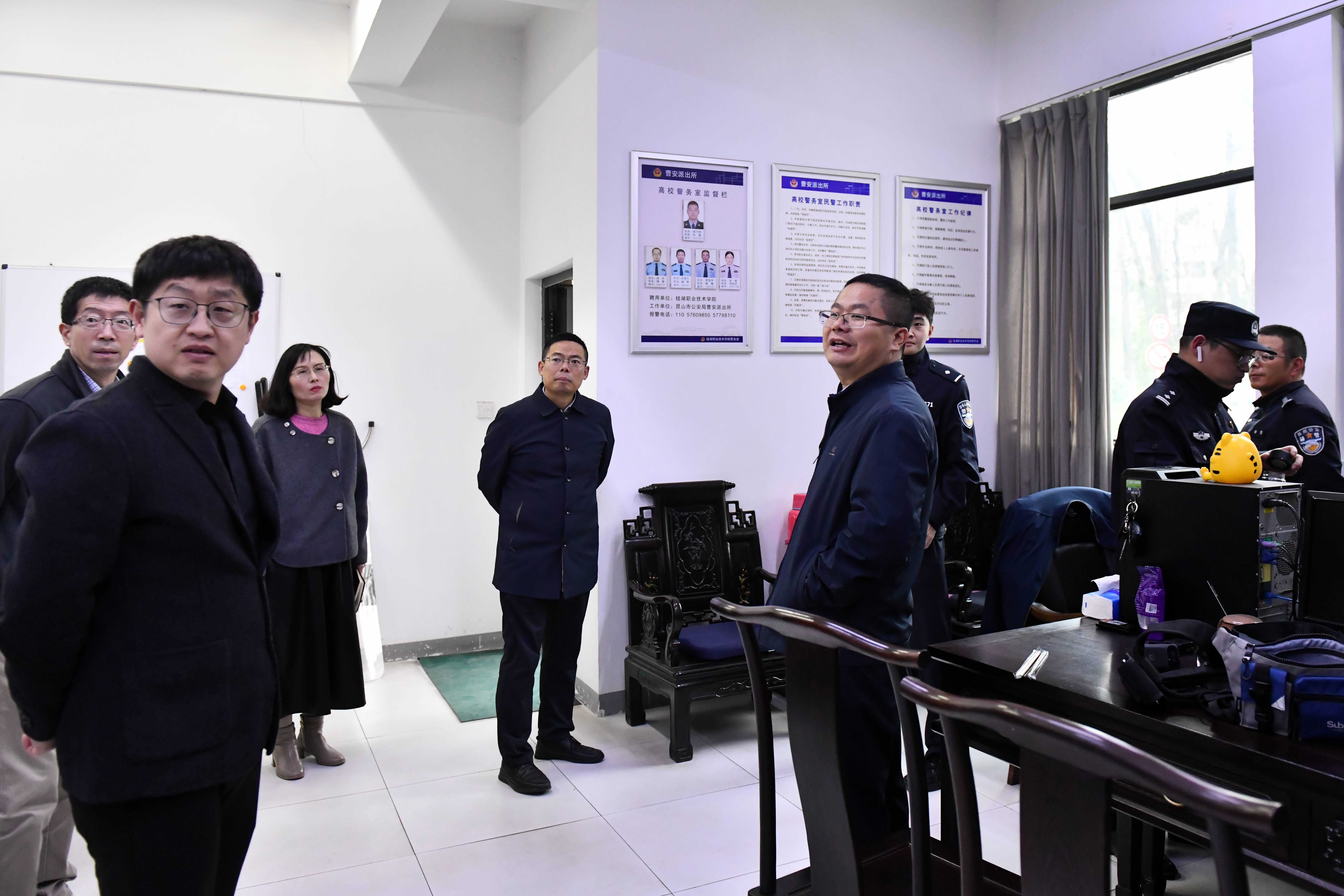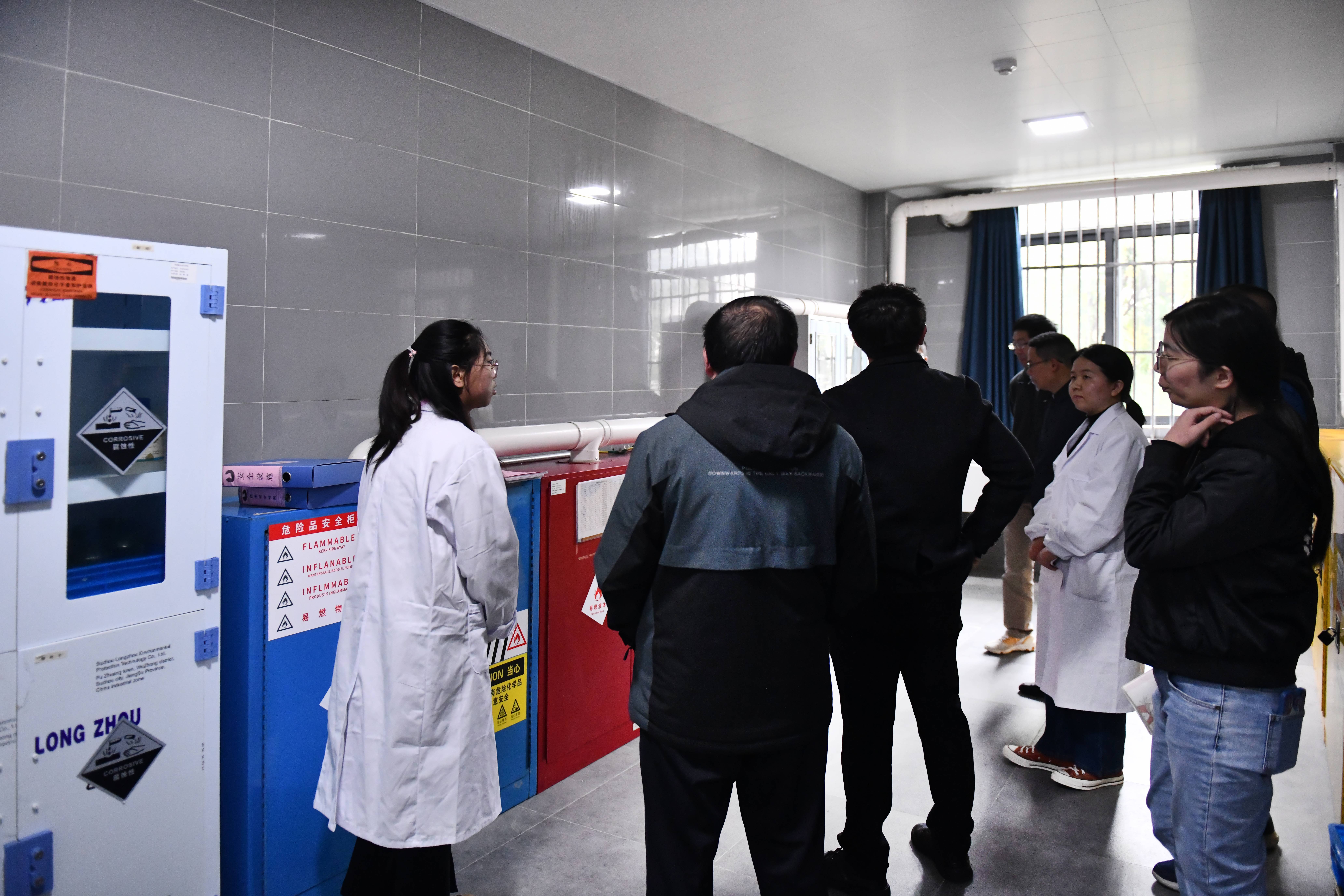 随后,教务处、学工处、后勤处、保卫处等部门领导陪同检查组对学校健康产业学院化学品暂存室、学校消控中心、学生公寓 E 栋、学生餐厅以及学校门卫室的安全工作实施情况进行了实地查看。